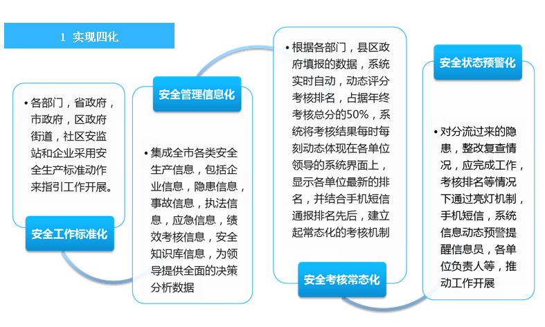 結(jié)合各部門(mén)履行安全監(jiān)管職責(zé)的工作要求,制定各部門(mén)安全生產(chǎn)工作考核細(xì)則,將任務(wù)指標(biāo)工作情況,自查自報(bào)工作情況作為日常考核指標(biāo),安全生產(chǎn)基礎(chǔ)工作和生產(chǎn)安全事故控制指標(biāo)的情況進(jìn)行年終考核指標(biāo),突出工作過(guò)程和結(jié)果量化,明確有針對(duì)性的具體量化的考核要求。對(duì)各省、市、區(qū)縣政府相關(guān)職能部門(mén)設(shè)立績(jī)效考核指標(biāo),依據(jù)系統(tǒng)數(shù)據(jù)自動(dòng)統(tǒng)計(jì),自動(dòng)積分,自動(dòng)排名。