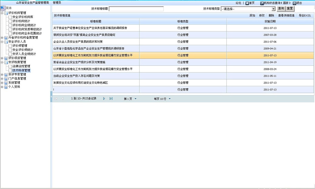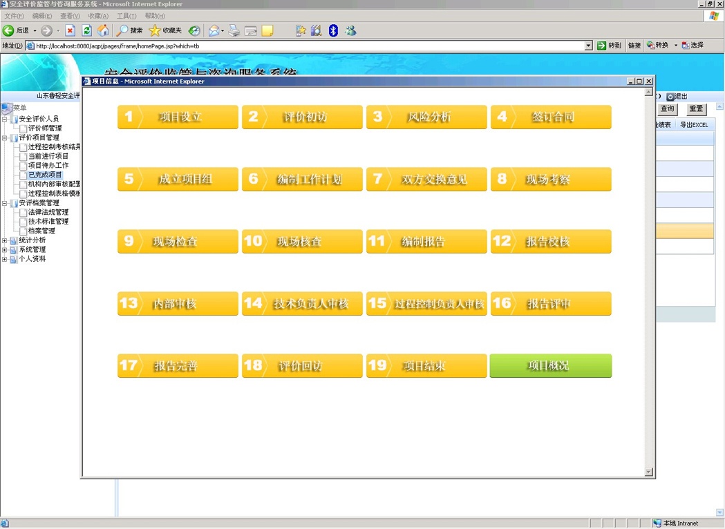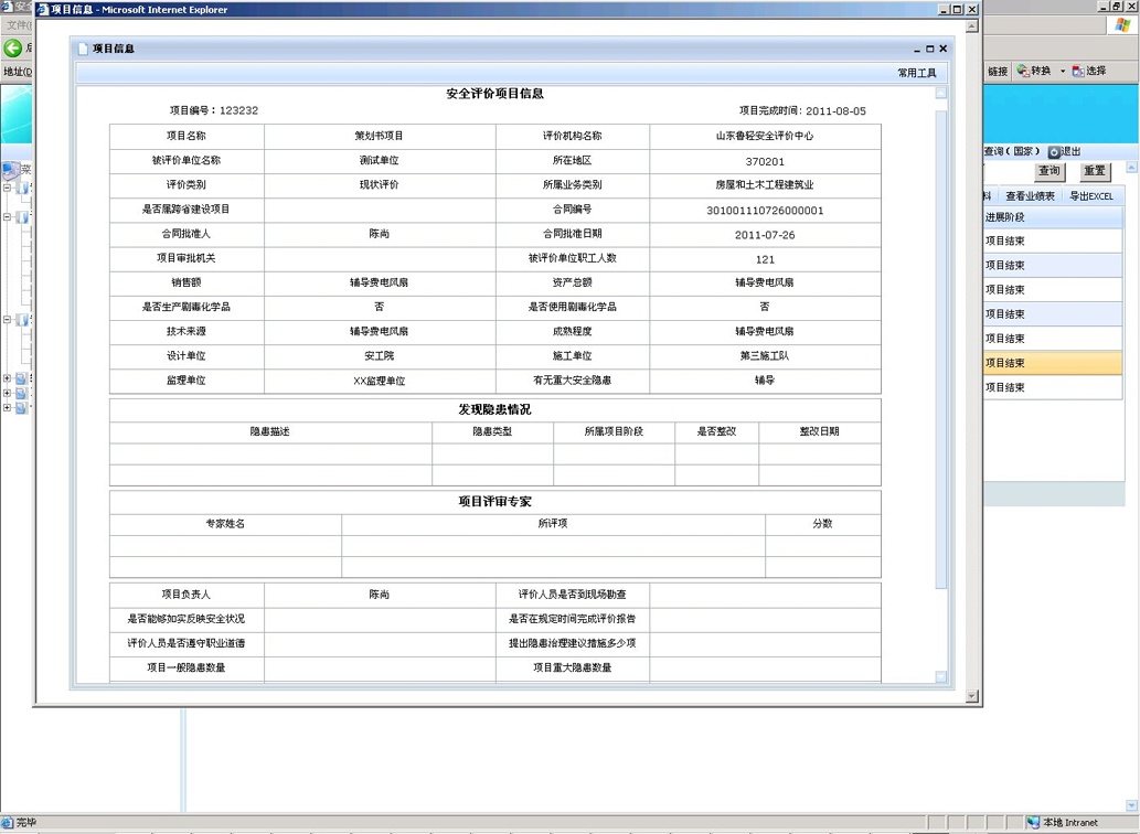 按照安評過程控制標(biāo)準(zhǔn),結(jié)合安全評價機構(gòu)的日常工作流程,對安全評價整個過程進行網(wǎng)絡(luò)化地控制和監(jiān)管,根據(jù)風(fēng)險分析、實施評價、報告審核、技術(shù)支撐、作業(yè)文件、內(nèi)部管理、檔案管理和檢查改進八要素對所有評價項目過程進行嚴格把關(guān),要求安全評價機構(gòu)將現(xiàn)有項目的進度情況及時上報到系統(tǒng)中,規(guī)范安全評價機構(gòu)工作流程,實現(xiàn)安全評價過程控制的信息化,在方便安全評價機構(gòu)內(nèi)部管理的同時有利于監(jiān)管部門對安全評價機構(gòu)的評價行為進行實時動態(tài)的監(jiān)督管理。
