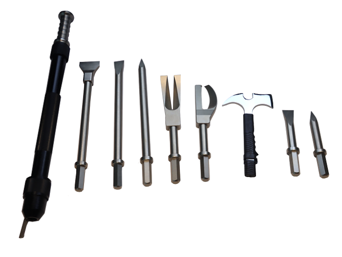 手動破拆工具手動破拆工具組由1個多功能手柄和與其配合使用的5個沖擊式破拆器工具頭、2個撬斧工具頭(包括1個金屬切割器工具頭和1個撬鎖拔釘器工具頭),伸縮式多功能消防斧、斧頭(多功能工具)和消防腰斧組成。