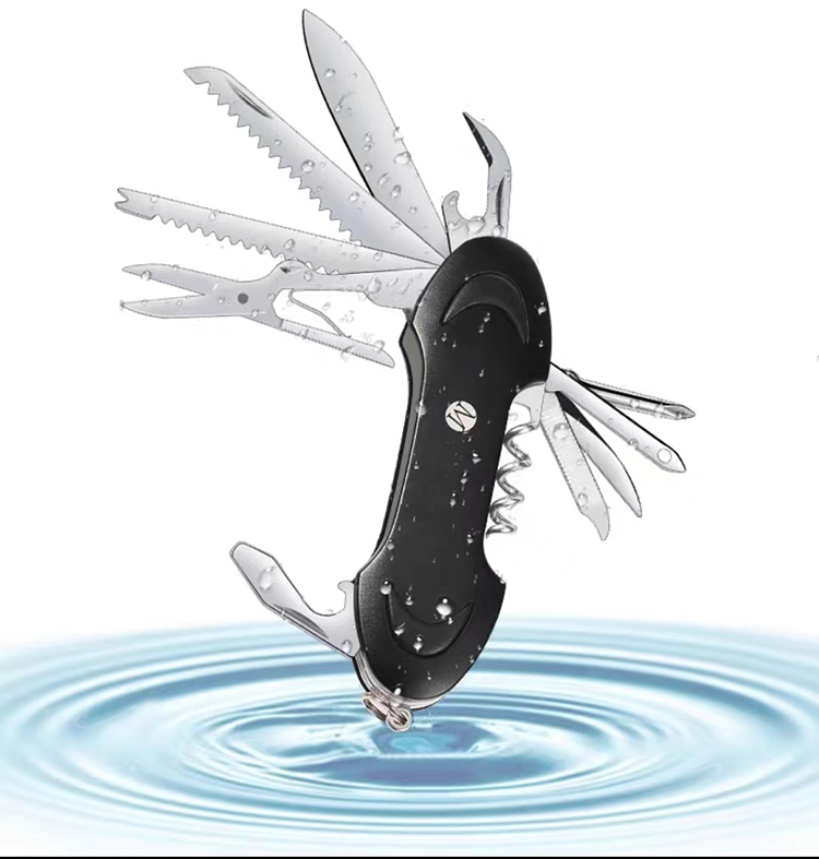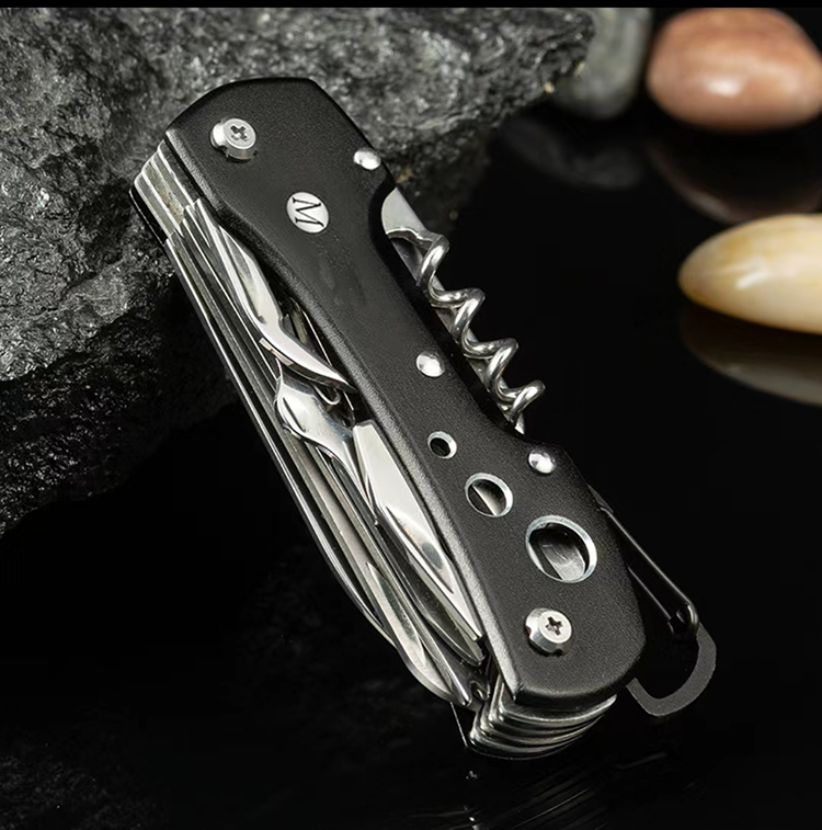 多功能刀又常稱為多功能戶外刀或萬用刀,是含有許多工具在一個刀身上的折疊小刀。多功能刀的組合工具不僅表現(xiàn)在品種上,同時還在于巧妙的組合在同一種工具上,使有限的工具發(fā)揮更多的實功能。一把普通的多功能刀,一般都有主刀、小刀、剪刀、開瓶器、木鋸、小改錐、拔木塞鉆、牙簽、小鑷子等工具。而在一些工具上還設(shè)計了多種功用。