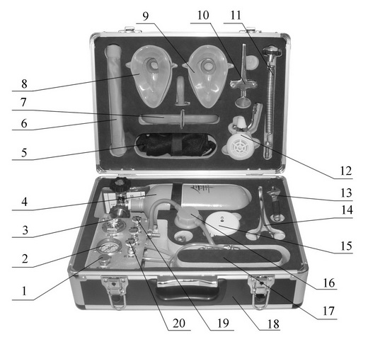 It is an emergency apparatus for automatically implementing breathing positive-negative pressure, and can continuously feed fresh air with oxygen into the lung of wounded person. Filled with oxygen for medical use, it could remove foreign matter in mouth and air duct and implement breathing when there is oxygen existed. With small in size, light in weight, easy to operate, reliable performance, convenient to carry features, it is specially used in the spot for disaster event, coal mine rescue, and also applied into emergency rescue and first aid for medical institute while out work as well as escorting the wounded person.