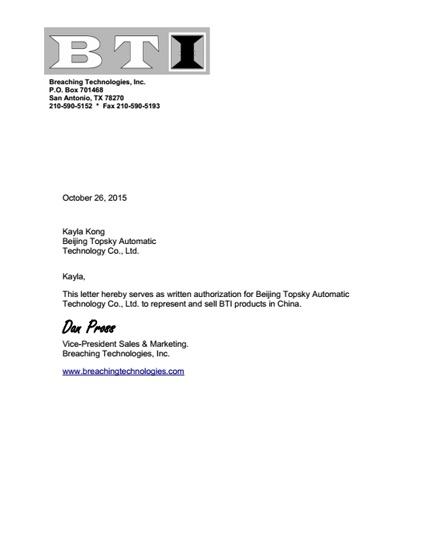 2015年10月26日 ,北京凌天成為 美國BTI 公司 黑鷹撞門器 一級代理