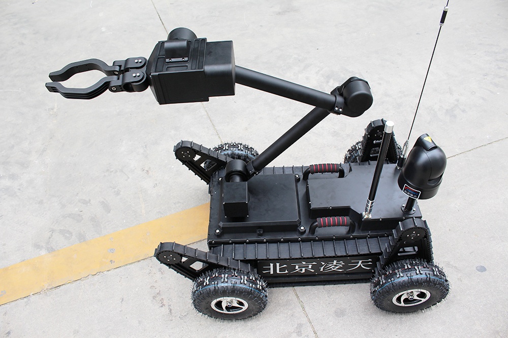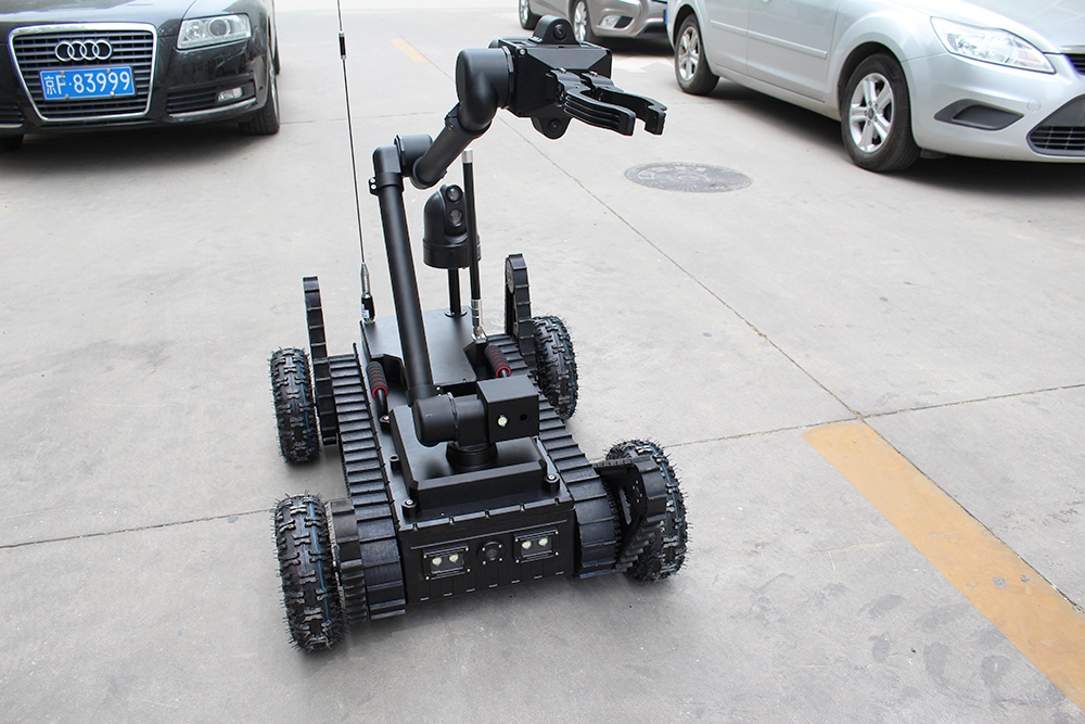 機械臂部分配備爆炸物銷毀器、瞄準(zhǔn)器,能現(xiàn)場對爆炸物進(jìn)行摧毀;