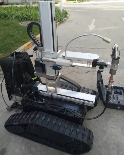 破拆機(jī)器人,也可用于遠(yuǎn)程遙控偵察人難以達(dá)到的地形的一種機(jī)器人。機(jī)器人配備十字滑臺(tái),靈活調(diào)動(dòng)工具的工作位置,可加載手持式切割機(jī),還可以加載獨(dú)立電動(dòng)液壓工具其包括:微型開(kāi)門(mén)器、微型擴(kuò)張器、微型剪切器之間可以靈活更換,底盤(pán)采用履帶結(jié)構(gòu),能適應(yīng)各種地形快速作戰(zhàn)部署。