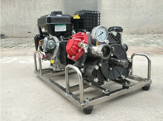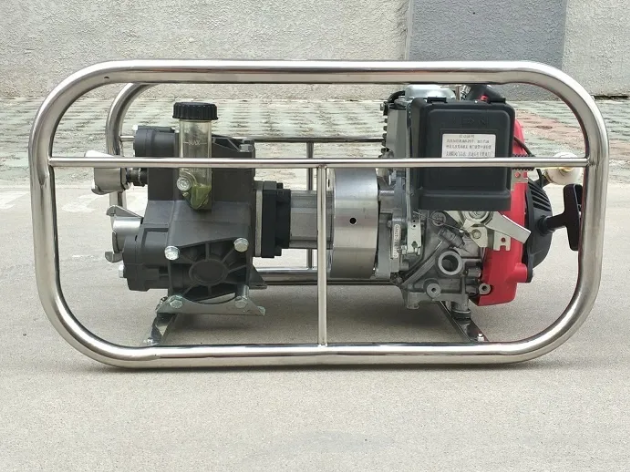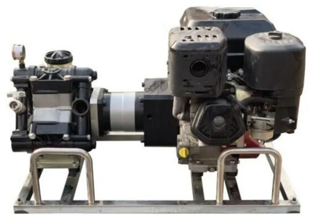 不銹鋼架,便于攜行。泵軸水平布置,減少震動。水泵泵體為柱塞液壓隔膜泵。允許砂石顆粒通過,對水質(zhì)要求低,對發(fā)動機功率損耗小。泵組可在橫向、縱向傾斜達到25°時正常工作。水帶直徑25mm,爆破壓力18MPa,表層滌綸長絲,內(nèi)襯進口橡膠,高壓森林接口連接。水泵配備的動力裝置為強制風(fēng)冷四沖程汽油機。我們的行星減速機通過特殊的處理方式,在發(fā)動機轉(zhuǎn)數(shù)超過2000轉(zhuǎn)的情況下,不會削弱發(fā)動機的動力,反而有助于發(fā)動機的動力,提高水泵的效率。