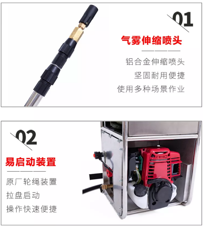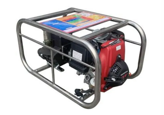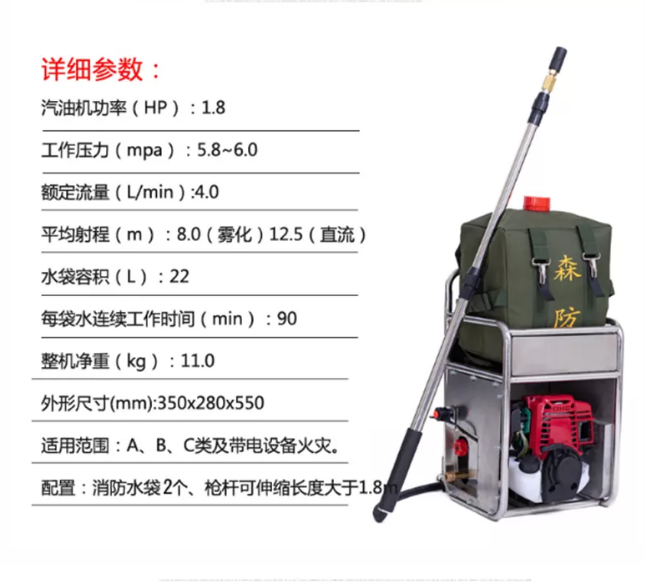不銹鋼架,便于攜行。泵軸水平布置,減少震動  水泵泵體為柱塞液壓隔膜泵。允許砂石顆粒通過,對水質(zhì)要求低,對發(fā)動機功率損耗小。  泵組可在橫向、縱向傾斜達到25°時正常工作。  水帶直徑40mm,爆破壓力18MPa,表層滌綸長絲,內(nèi)襯進口橡膠,高壓森林接口連接。  水泵配備的動力裝置為強制風(fēng)冷四沖程汽油機。