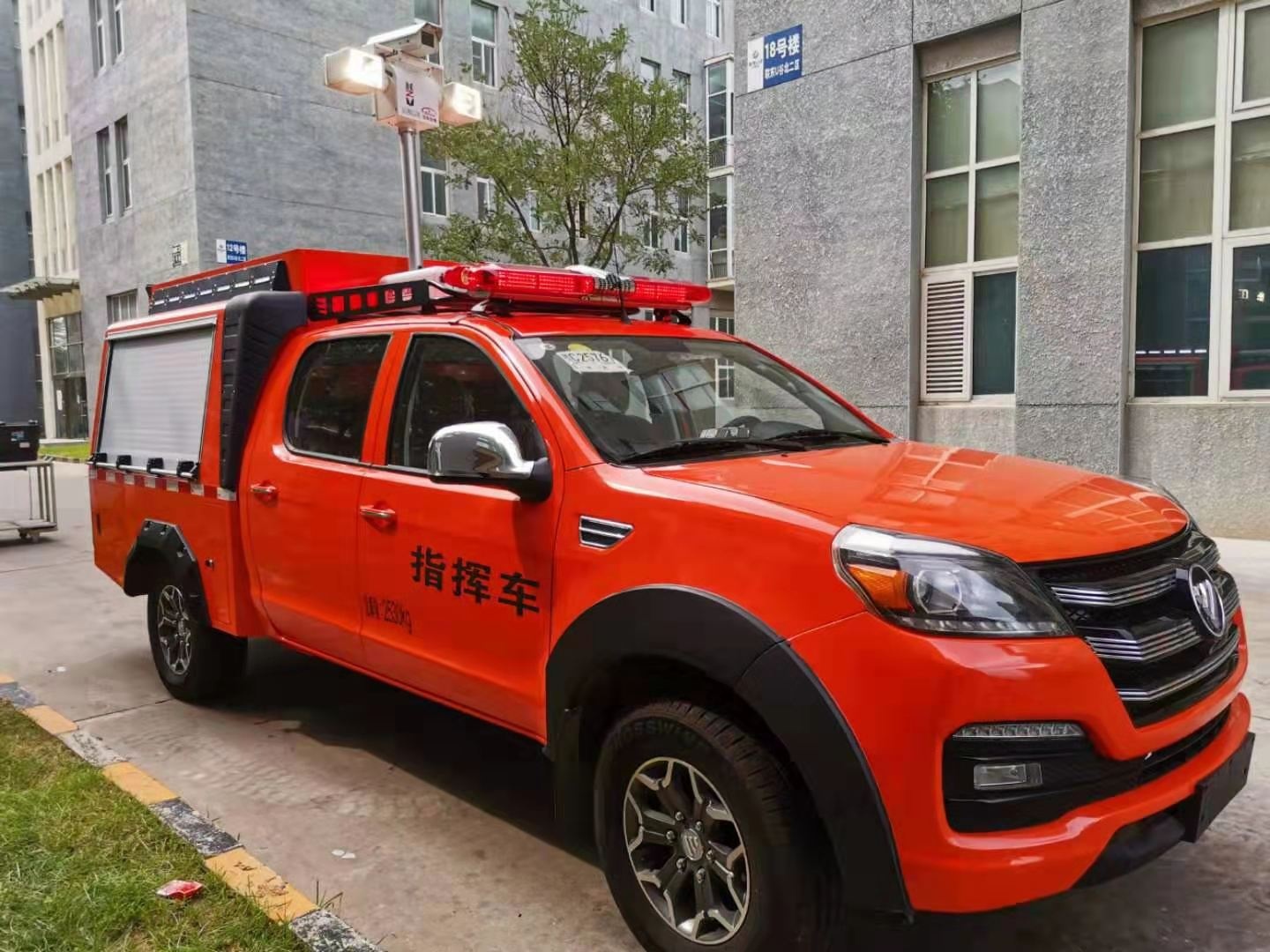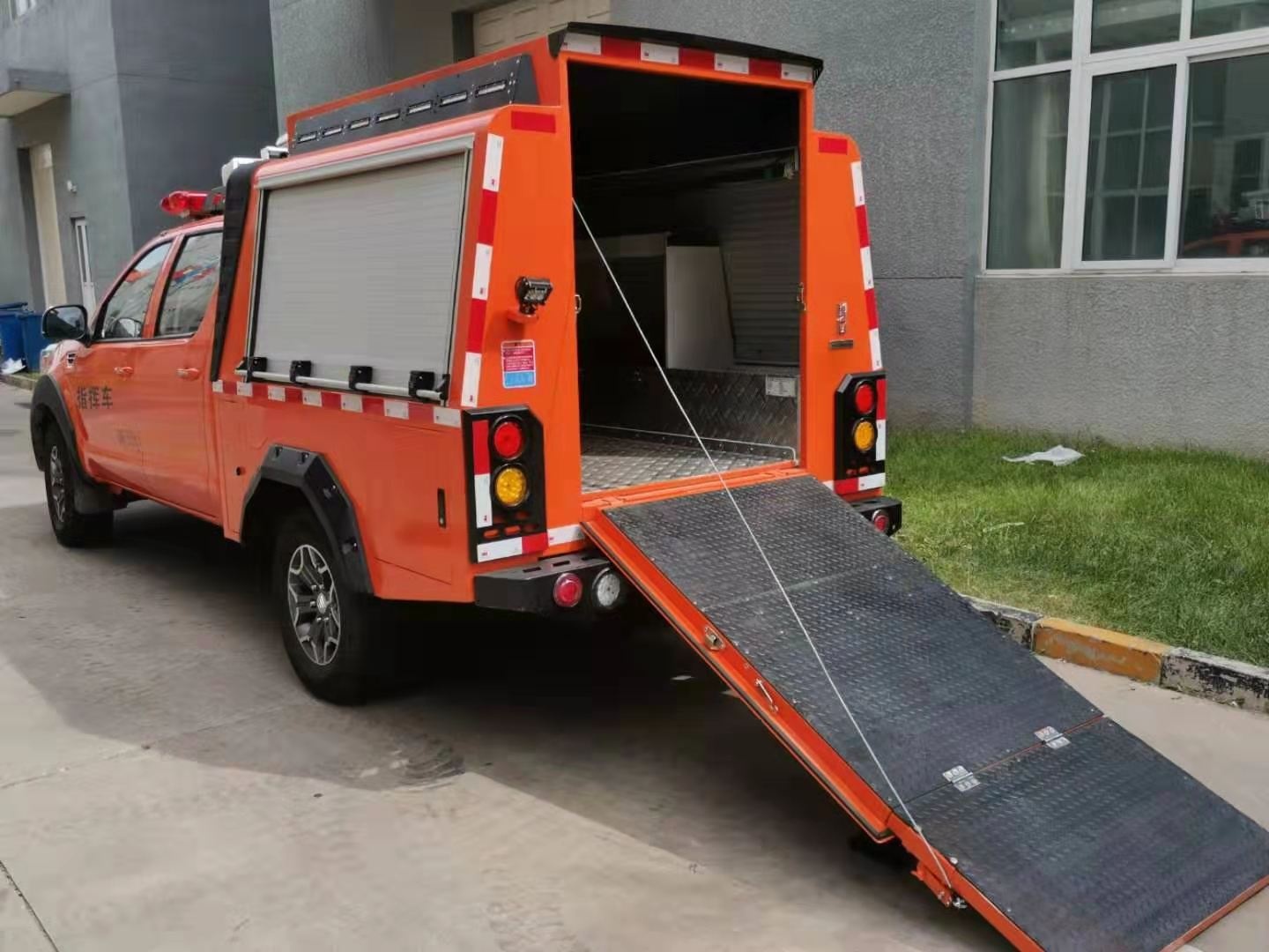 專(zhuān)門(mén)為特種機(jī)器人量身定做的一款機(jī)器人運(yùn)輸車(chē),由皮卡車(chē)改裝,區(qū)別于傳統(tǒng)意義上大型運(yùn)輸車(chē),體積更小,動(dòng)力更足。車(chē)廂設(shè)計(jì)有升降照明系統(tǒng),解決了救援現(xiàn)場(chǎng)能見(jiàn)度低的問(wèn)題,1.2-1.8米升降高度,可滿足不同照明需求。車(chē)體頂部裝有4G圖像傳輸系統(tǒng),可將現(xiàn)場(chǎng)情況實(shí)時(shí)傳輸?shù)街笓]部,有利于指揮現(xiàn)場(chǎng)調(diào)度。配有一體化機(jī)器人裝運(yùn)梯,最大承壓≥600Kg。后箱四周配有一圈小型照明系統(tǒng),可用于晚間或光線昏暗等環(huán)境。后箱設(shè)計(jì)有獨(dú)立儲(chǔ)物架,可放置機(jī)器人配套設(shè)備。兩側(cè)卷閘窗設(shè)計(jì)方便拿用。