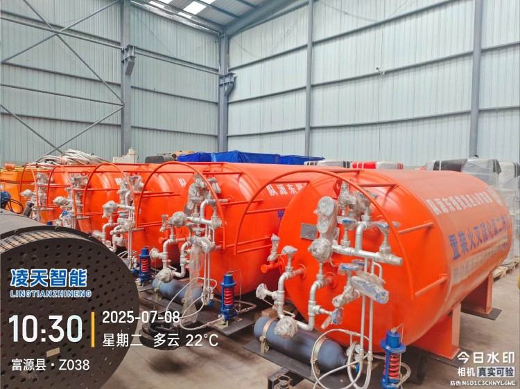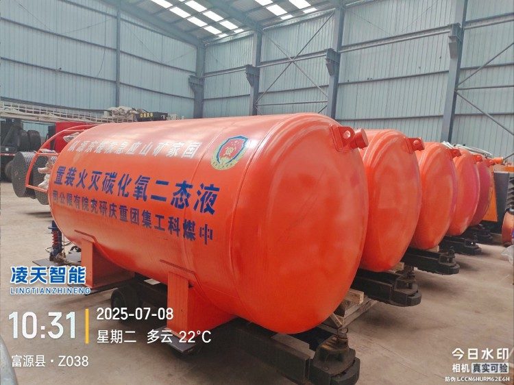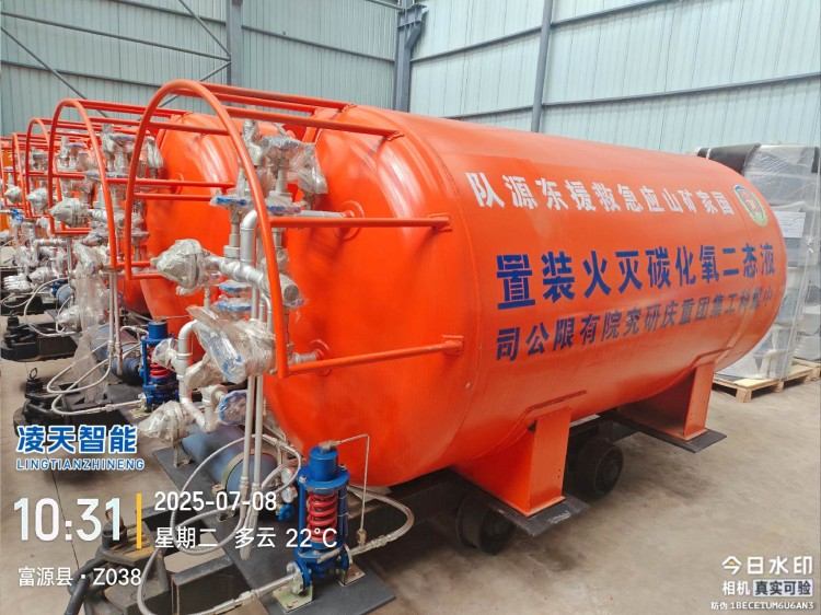 液態(tài)二氧化碳滅火裝置,采用平板車為運載平臺,搭載液態(tài)二氧化碳滅火模塊,采用液態(tài)二氧化碳為滅火劑,運輸至井下火區(qū)近附,經自增壓調控系統(tǒng)實現(xiàn)罐內穩(wěn)壓,并通過遠距離輸送管路將液體從罐內向密閉火區(qū)噴射,利用其急速膨脹氣化和吸熱效率高的物理特性,可實現(xiàn)惰性降氧,吸熱降溫,吸附阻化等功能,從而可快速進行井下煤層自燃火災的預防與撲滅等。
