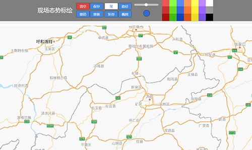 現(xiàn)場(chǎng)態(tài)勢(shì)標(biāo)繪,可進(jìn)入到地圖中,進(jìn)行線路的制作、路徑、矩形、圓形等操作選擇,及可對(duì)操作步驟進(jìn)行撤銷(xiāo)及畫(huà)筆的顏色選擇