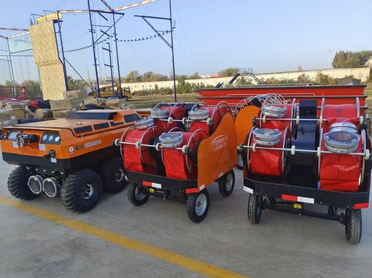 供排水機(jī)器人配有大口徑水帶收放車,采用電動快速鋪設(shè)系統(tǒng),操作簡單,實用性強(qiáng)等特點(diǎn),解決了人力收放水帶的不便利性,增加了救援時間。