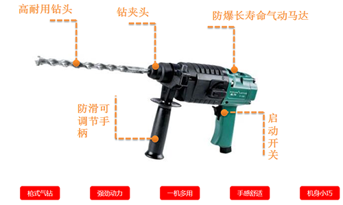 主要用于巖石,磚墻,混凝土等構件上鑿孔,作安裝管道、架設動力線路、安裝地腳螺栓、化工廠、精煉廠、建筑、重工業(yè)、危險潮濕的隧道、水下及狹窄的空間作業(yè);尤其在高瓦斯防爆礦井中,氣動防爆無火花更能體現安全性。它是提高工效,減輕勞動強度的工具.