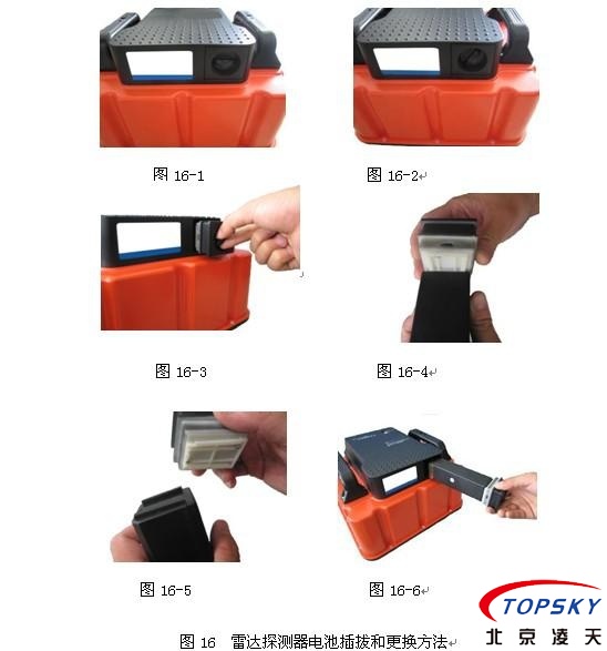 YSR25本安型雷達(dá)生命探測儀的雷達(dá)探測器配備了兩塊可充電鋰離子電池,其插拔、更換步驟如下,見圖16。