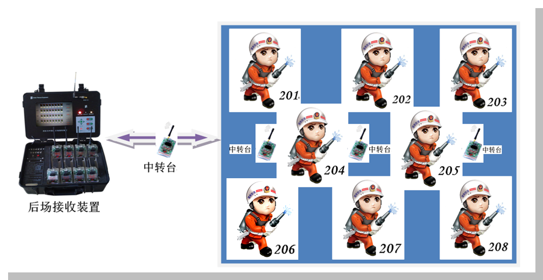 指揮員可根據(jù)監(jiān)視的情況,發(fā)出單呼巡查,群呼巡查,單呼撤退,群呼撤退的指令。呼救器佩戴人員可實時接收指令,通過聲響提示查看巡查和撤退的狀態(tài),實時 互動回應(yīng),為指揮員直觀判斷現(xiàn)場的情況,提供非常可靠的指揮依據(jù)。該設(shè)備配套的呼救器具有遠(yuǎn)距離數(shù)據(jù)通信功能,具有群組獨立使用的功能。其中一個呼救器報警,群組呼救器都能有聲響提示,顯示報警的編組編號,兼有現(xiàn)場指揮員主呼撤退的功能。每套產(chǎn)品編組顯示:1-4組,每組編號顯示:1-8人 ,每套最大使用數(shù)量32人,可編不同ID套數(shù):40套,可編不同組號:160組,可編不同ID號:1280個編號 。