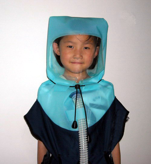 適合兒童(3—8歲)使用,為有效回避戰(zhàn)爭(zhēng)毒氣或有害環(huán)境而設(shè)計(jì)的防毒面罩。利用送風(fēng)機(jī)將外部空氣通過濾毒罐送入頭罩內(nèi),形成密閉正壓,使得呼吸方便,活動(dòng)無不適現(xiàn)象。
